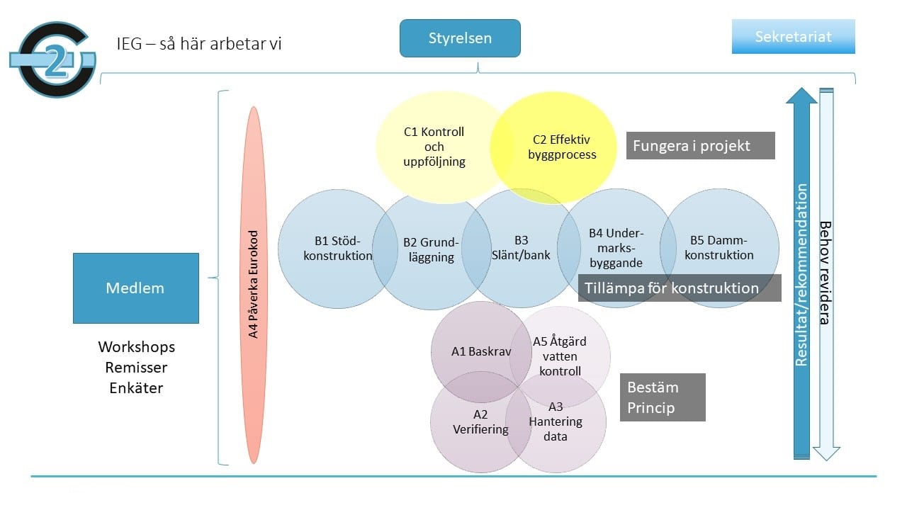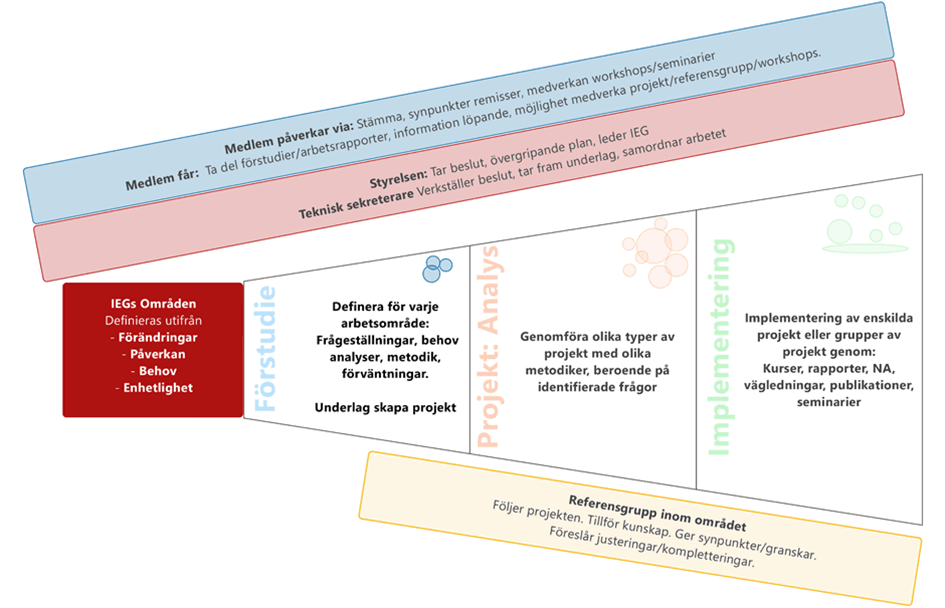 IEG 2.0Arbetsformer Kontakta ossIEG 2.0IEG driver sitt arbete i tre olika faser enligt nedanstående bildInitiering/identifiering frågeställningarAnalys fasImplementering (kurser, underlag Nationell bilaga, tillämpningsdokument). Inom ramen för Analysfasen genomförs arbetet i tre grupper av delområden:Etablera grundläggande principerTillämpa/testa principer per konstruktionApplicera på projekt